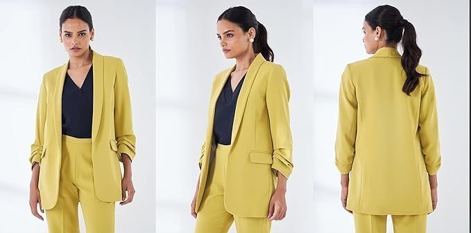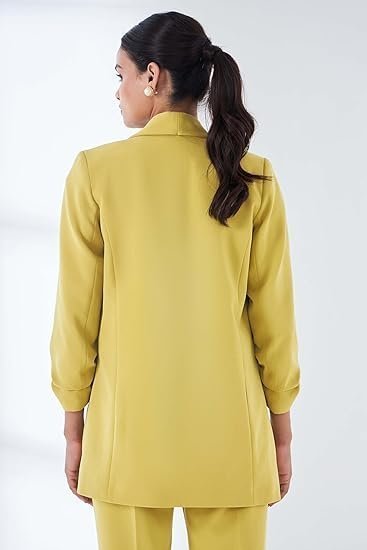 Be the first to review “Spunky-Chartreuse Yellow Ruched Sleeve Blazer” Cancel reply