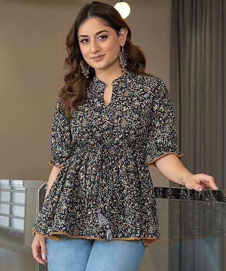 Printed Top with Contrast Tipping – Stylish Ethnic & Western Tops for Women – Summer Travel Wear, Trendy Tops for Jeans, Lightweight & Comfortable Casual Wear